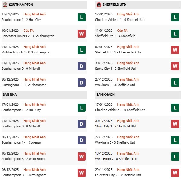 Tổng thể từ đầu Championship 2025/26, Southampton mới thắng được 5/12 trận sân nhà dù chưa bao giờ bị xếp dưới. Điều tích cực là đã 6 màn đụng độ Sheffield Utd tại các giải đấu chính thức, Southampton chẳng những không thua mà còn khải hoàn đến 5 lần.