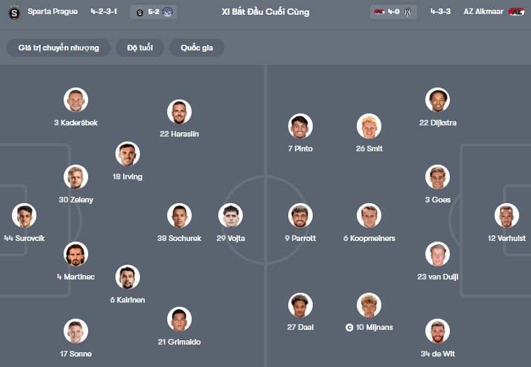 Đội hình dự kiến Sparta Praha vs AZ Alkmaar:
