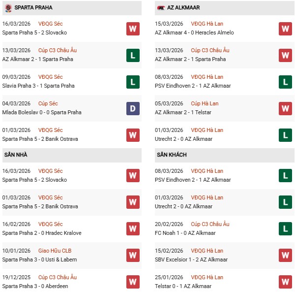 Thống kê phong độ Sparta Praha vs AZ Alkmaar: