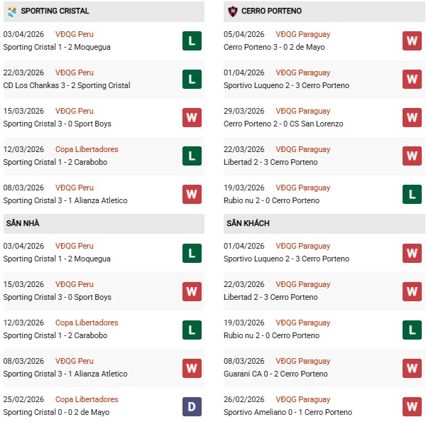 - Sporting Cristal hòa 1, thua 1 trong 2 trận gặp Cerro Porteno gần đây.