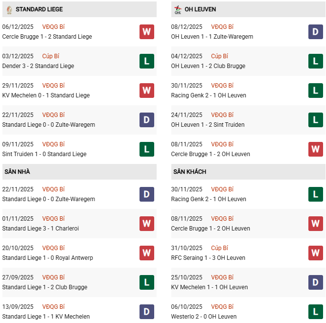 - Trên sân nhà, Standard Liege thắng 2, thua 3 trước Leuven.