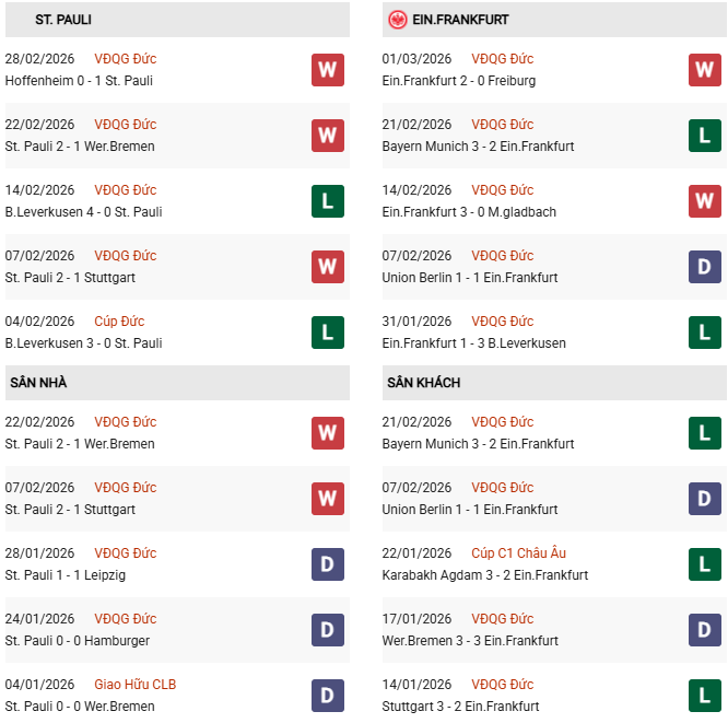 - Trên sân nhà, St.Pauli thắng 1, thua 3 trước Frankfurt.