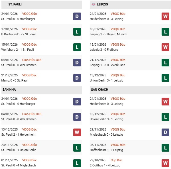 Sân nhà cũng không phải là lợi thế của St.Pauli. Bởi trong 17 lần tiếp đón các đối thủ gần đây tại sào huyệt của mình, thành tích của họ chỉ khiêm tốn với 3 chiến thắng, 6 trận hòa và 8 trận thua. Với căn bệnh “dại nhà” như thế, rất khó để St.Pauli làm nên bất ngờ trước đội đang nằm trong Top 4 ở Bundesliga như Leipzig.