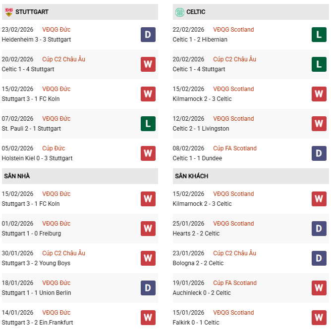Thống kê phong độ Stuttgart vs Celtic: