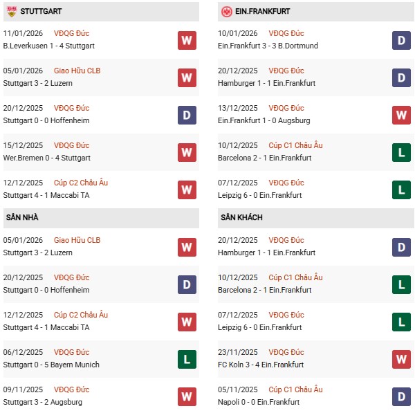 Thống kê phong độ Stuttgart vs Frankfurt: