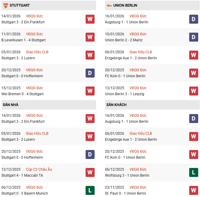 - Trên sân nhà, Stuttgart thắng 4, thua 1 trước Union Berlin.