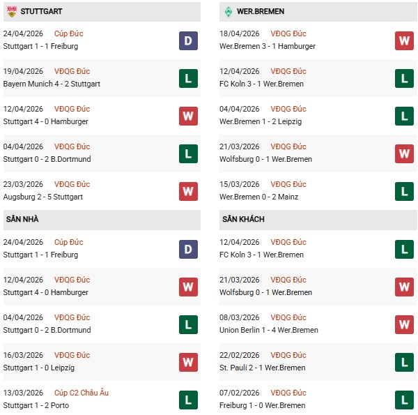 - Stuttgart thắng 4, hòa 3, thua 3 trong 10 trận gặp Werder Bremen gần đây.