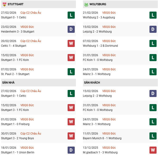 Thống kê phong độ Stuttgart vs Wolfsburg:
