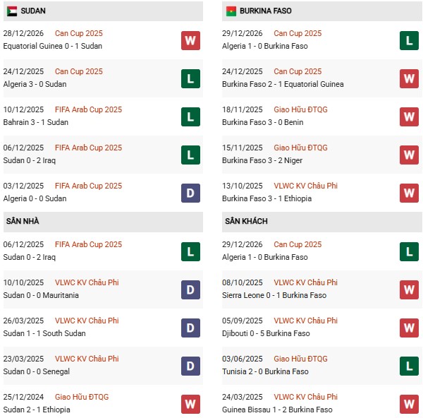Thành tích đối đầu Sudan vs Burkina Faso: