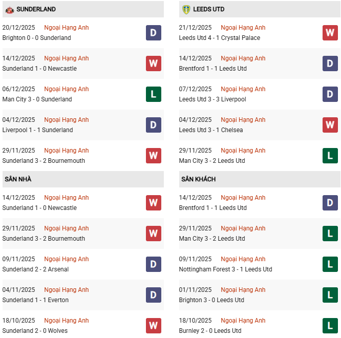 - Trên sân nhà, Sunderland thắng 4, thua 2 trước Leeds.