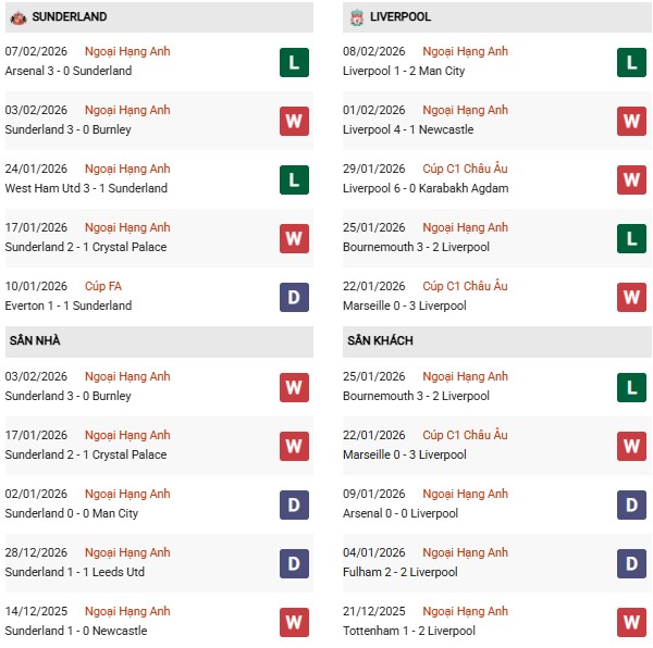 - Trên sân nhà, Sunderland thắng 2, thua 6 trước Liverpool.
