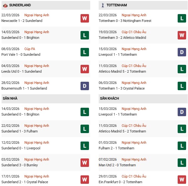 - Trên sân nhà, Sunderland thắng 2, thua 4 trước Tottenham.
