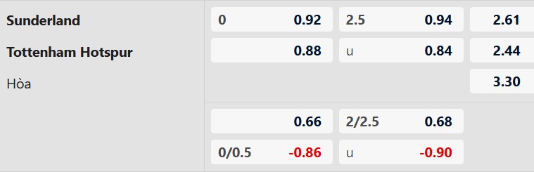 Mức Tài xỉu 2 1/2 cho thấy kỳ vọng ở mức trung bình. Thực tế, các trận gần đây của Sunderland không quá bùng nổ về số bàn thắng, trong khi Tottenham lại gặp khó trong khâu ghi bàn. Với việc đội chủ nhà có xu hướng chơi chắc chắn còn đội khách thiếu hiệu quả tấn công, khả năng cao trận đấu sẽ không có nhiều bàn thắng.