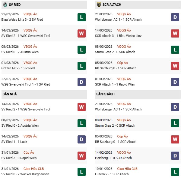 Thống kê phong độ SV Ried vs Altach: