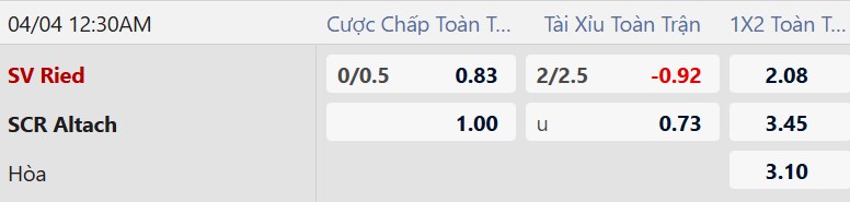 Thông tin tỷ lệ kèo SV Ried vs Altach: