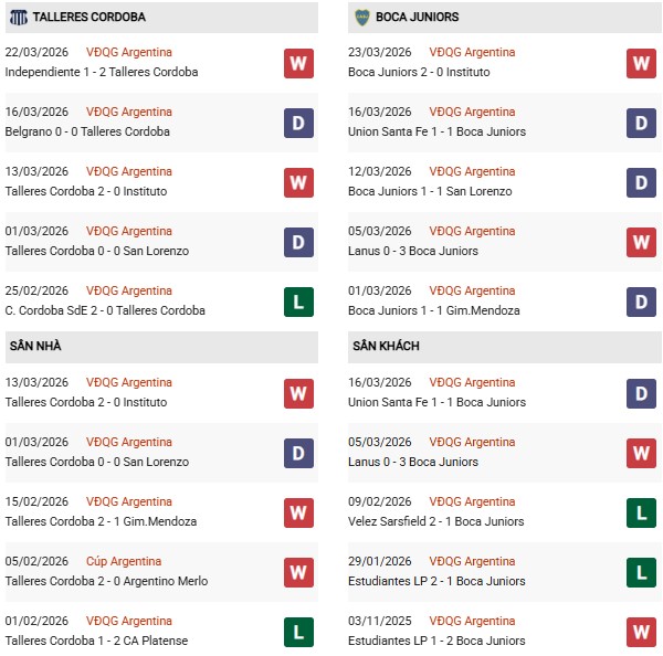Thống kê phong độ Talleres vs Boca Juniors: