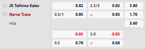Tallinna Kalev thua kèo tới 4/5 trận đấu mới đây chạm mặt Trans Narva. Tallinna Kalev thua kèo 4 trận đấu gần nhất có trên sàn giao dịch châu Á. Trans Narva bất bại kèo 4 trận đấu mới đấy có tỷ lệ handicap.