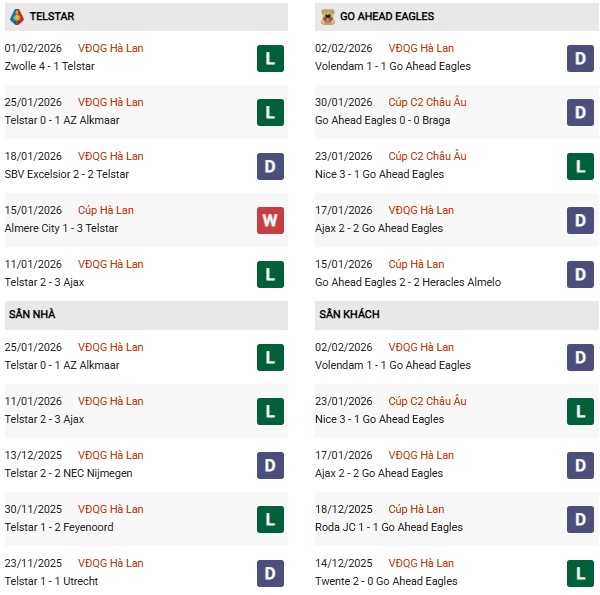 Thống kê phong độ Telstar vs Go Ahead Eagles: