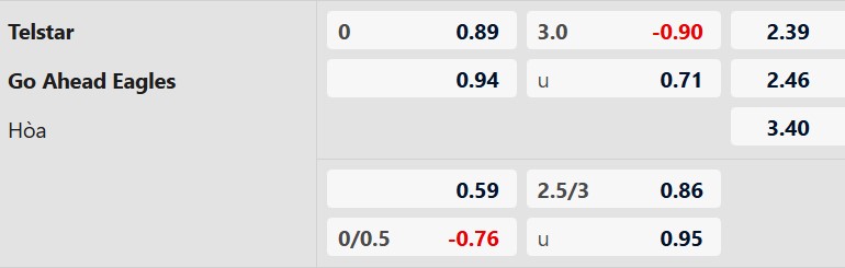 Go Ahead Eagles là đội bóng ghi bàn hay thủng lưới đều nhiều, dẫn đến việc tỷ lệ lớn cuộc chơi có không dưới 3 pha lập công. Đa phần trận sân nhà mùa này của Telstar có kết cục tương tự mà ít nhiều do bàn thắng xuất hiện cả hai đầu. 9/13 màn chạm trán mới đây giữa hai đội cũng không phải ngoại lệ.