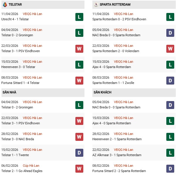 - Telstar thắng 2, hòa 3, thua 5 trong 10 trận gặp Sparta Rotterdam gần đây.
