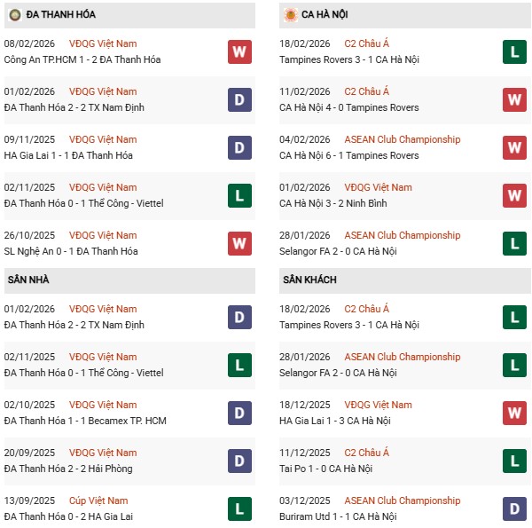 Thống kê phong độ Thanh Hóa vs CAHN: