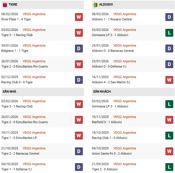 Thống kê phong độ Tigre vs Aldosivi: