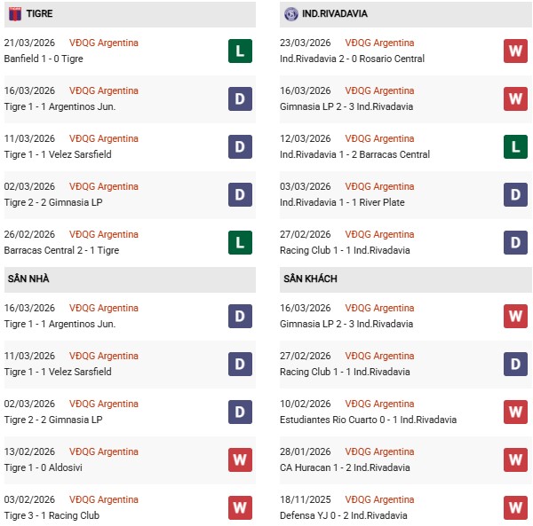- Tigre thắng 1, hòa 1, thua 2 trong 4 trận gặp Independiente Rivadavia gần đây.