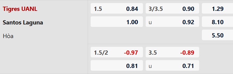 Thông tin tỷ lệ kèo Tigres UANL vs Santos Laguna: