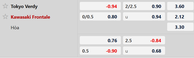 Thông tin tỷ lệ Tokyo Verdy vs Kawasaki Frontale: