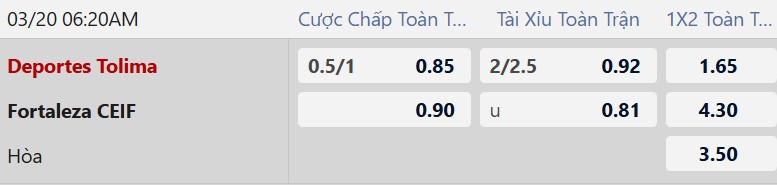Thông tin tỷ lệ bóng đá Tolima vs Fortaleza CEIF: