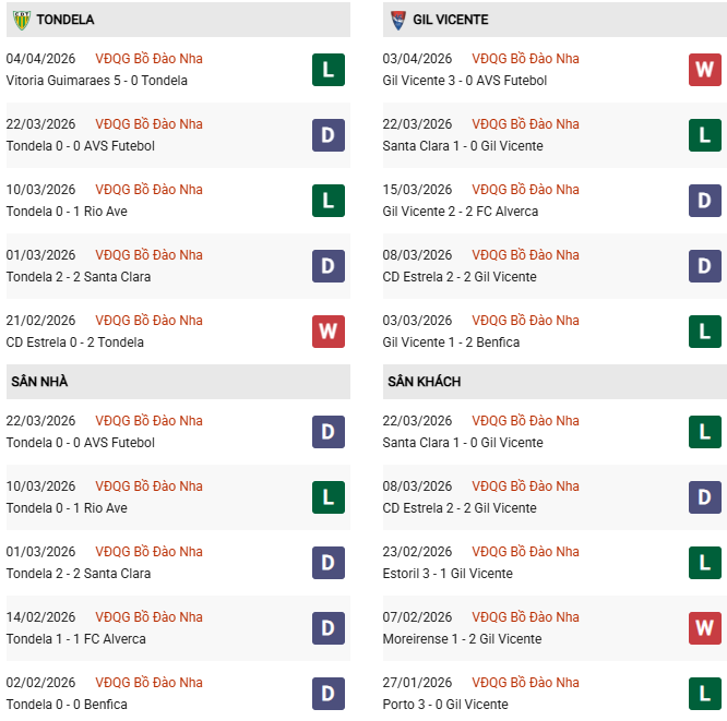 - Tondela thắng 2, hòa 3, thua 5 trong 10 trận gặp Gil Vicente gần đây.