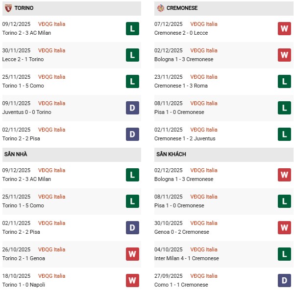 - Torino thắng 5, hòa 3, thua 2 trong 10 trận gặp Cremonese gần đây.