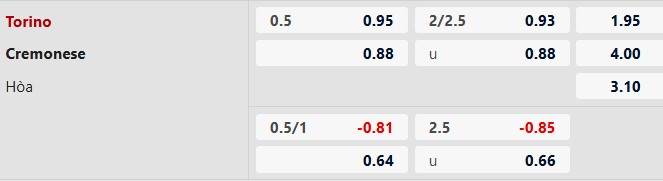 Thông tin tỷ lệ kèo Torino vs Cremonese: