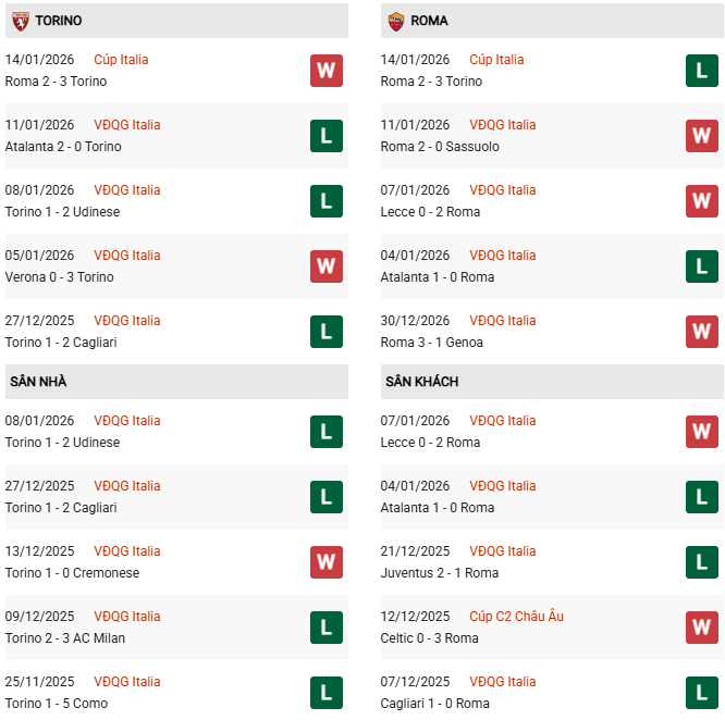 - Torino thắng 2, hòa 2, thua 6 trong 10 trận gặp Roma gần đây.