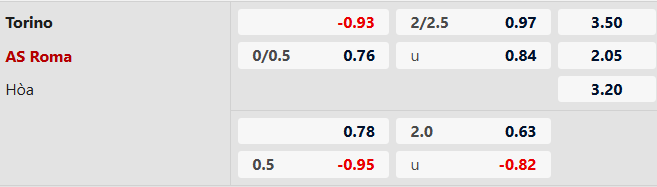 Roma thắng theo châu Á: Roma thắng 5/8 chuyến làm khách gần nhất tại Torino, thắng 5/8 trận gần đây và thắng 15/19 chuyến xa nhà vừa qua. Còn Torino thua 6/9 trận gần đây tại Serie A, thua 5/6 trận sân nhà gần đây.