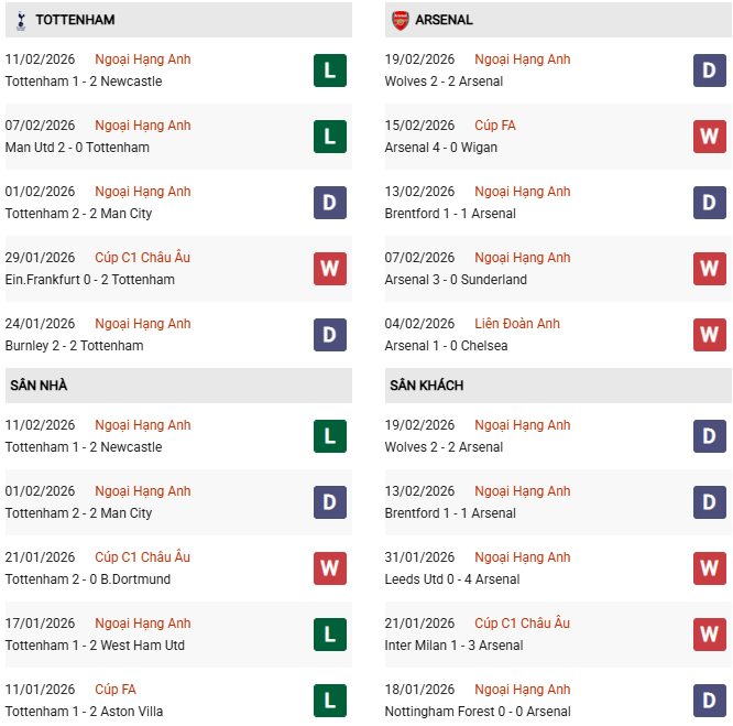 Thống kê phong độ Tottenham vs Arsenal: