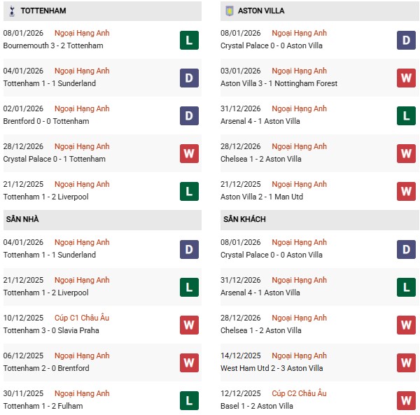 Phong độ gần đây của Tottenham hết sức bất ổn. Theo quan sát, Gà trống chỉ giành 1 chiến thắng trong 6 trận đấu gần đây tại các giải chính thức, còn lại họ hòa 2 và phải nhận 3 thất bại, mới nhất là trận thua 2-3 trước chủ nhà Bournemouth tại giải Ngoại hạng Anh. Thế nên, sẽ không bất ngờ nếu Tottenham sẽ phải nếm mùi thất bại trước Aston Villa ngay ở London!