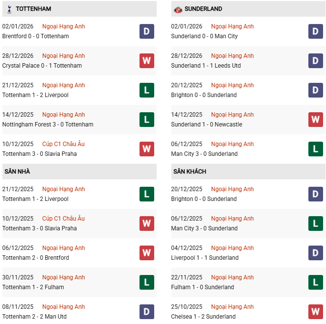 Thống kê phong độ Tottenham vs Sunderland: