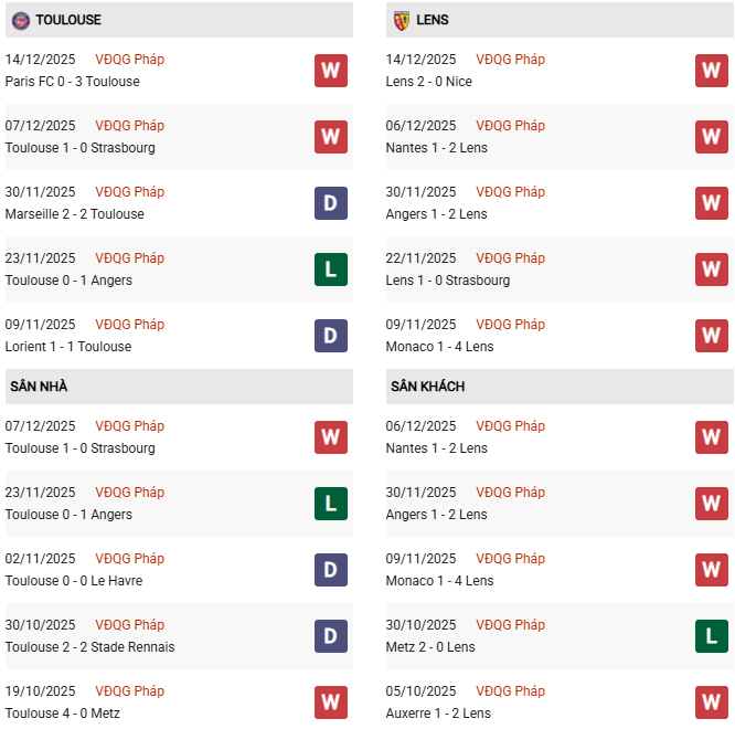- Trên sân nhà, Toulouse thắng 1, thua 4 trước Lens.