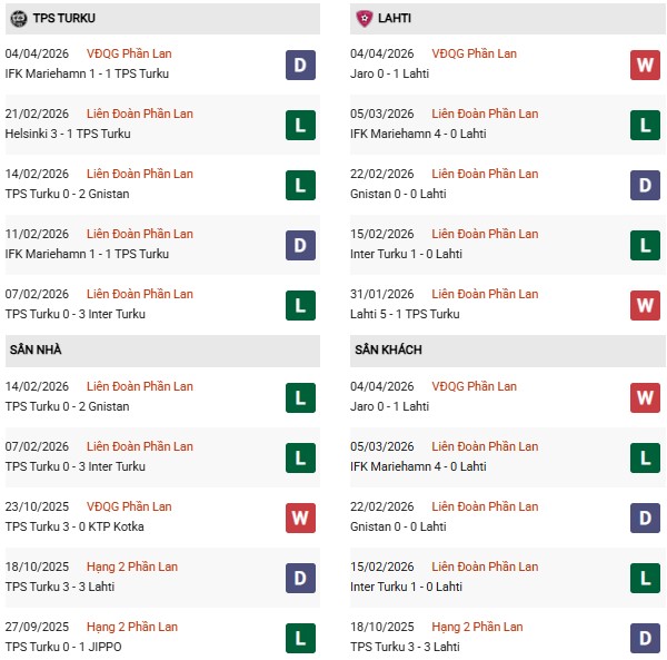 - TPS Turku thắng 2, hòa 5, thua 3 trong 10 trận gặp Lahti gần đây.