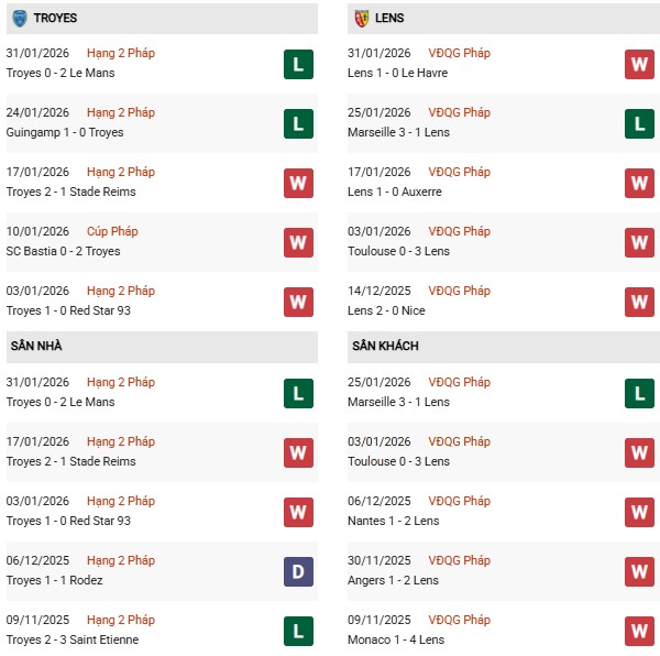 - Trên sân nhà, Troyes thắng 5, thua 2 trước Lens.