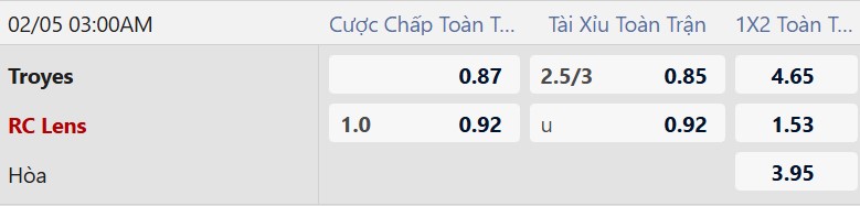Lens thắng theo châu Á: Lens thắng 4, hòa 1, thua 1 ở 6 chuyến làm khách gần nhất tại Troyes, thắng 8/12 trận gần đây, thắng 5/6 chuyến làm khách vừa qua. Còn Troyes thua cả 2 trận gần nhất. Xem ra, giới mộ điệu có thể tin tưởng vào Lens ở trận này.
