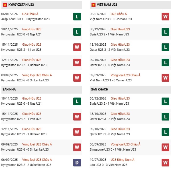 Thống kê phong độ U23 Kyrgyzstan vs U23 Việt Nam: