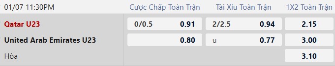 Thông tin tỷ lệ U23 Qatar vs U23 UAE: