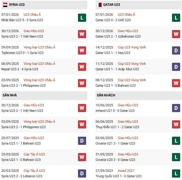 Thống kê phong độ U23 Syria vs U23 Qatar:
