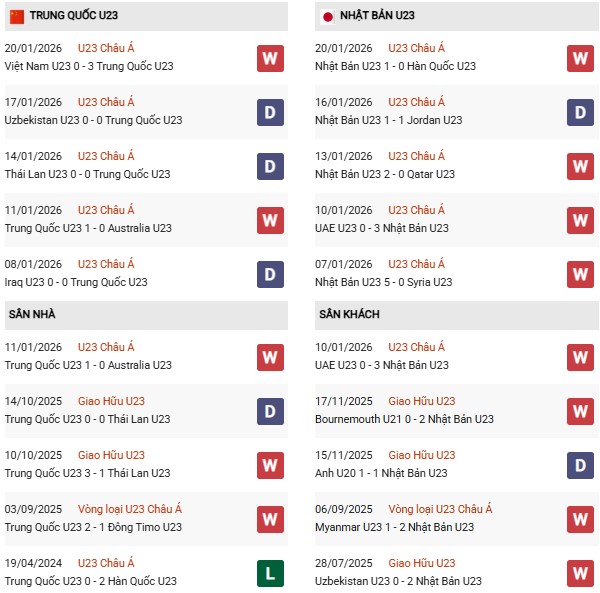 Thống kê phong độ U23 Trung Quốc vs U23 Nhật Bản: