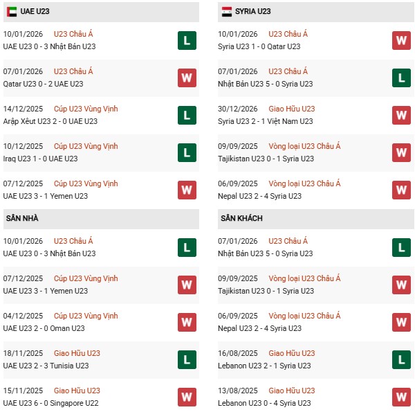 Thống kê phong độ U23 UAE vs U23 Syria:
