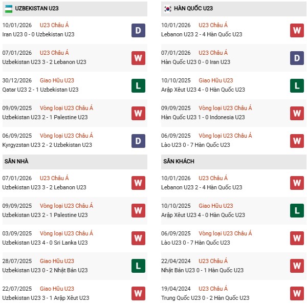 Thống kê phong độ U23 Uzbekistan vs U23 Hàn Quốc: