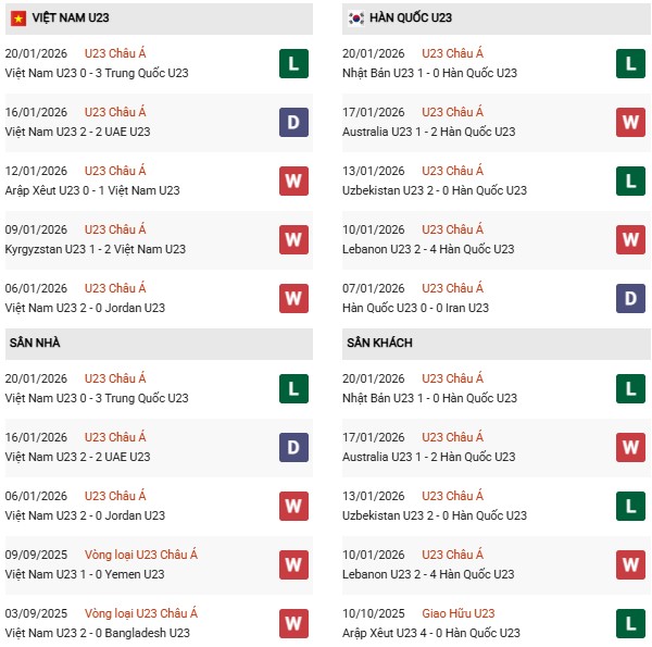 Thống kê phong độ U23 Việt Nam vs U23 Hàn Quốc: