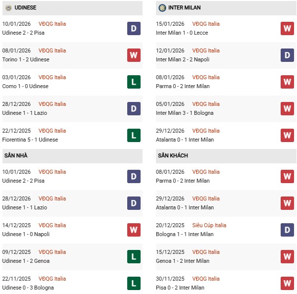 Thống kê phong độ Udinese vs Inter Milan: